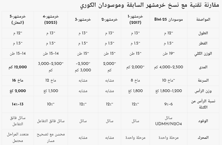 التقرير أوضح أن “خرمشهر-5” قادر نظريًا على ضرب أي نقطة في الولايات المتحدة من داخل الأراضي الإيرانية ، وأنه يبني على ميزات “خرمشهر-4” الذي أُطلق عام 2023 ، مع تحسينات في المدى والسرعة وزمن التجهيز. كما أشار إلى استخدام وقود سائل فائق التفاعل قابل للتخزين ، ومحرك متعدد المراحل ، ورأس حربي ضخم يمكن يشبه القنابل الأمريكية الخارقة للتحصينات.